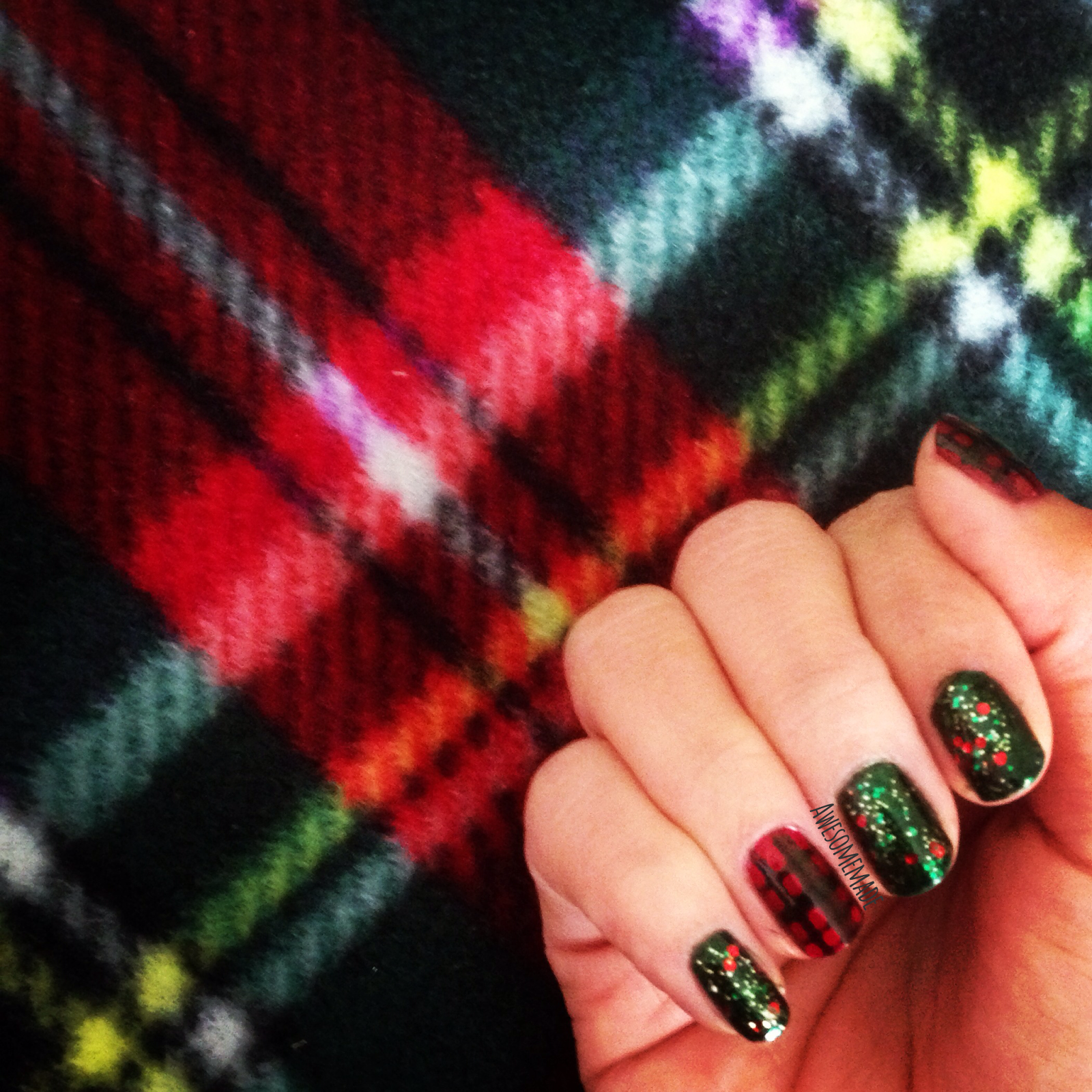 I used a shimmery green and topped it with China Glaze Party Hearty (my go-to Christmas glitter) and then for the plaid/lumberjack nails, I used a red creme base and painted lines of various thickness using black polish with a built in striper brush. Merry cheesy Christmas!